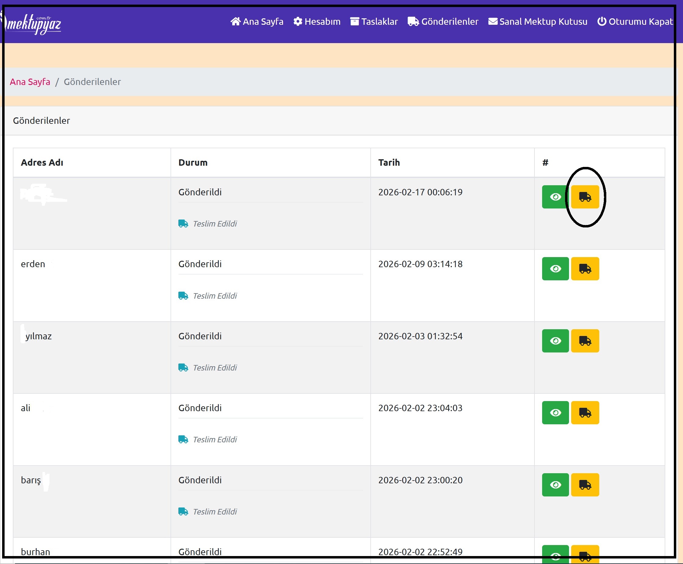 E-Devlet ve PTT Entegrasyonu: Gönderilenler sayfasındaki sarı araç simgesine tıkladığınızda, sistem sizi barkod numaranızla birlikte resmi sorgulama sayfalarına yönlendirir.