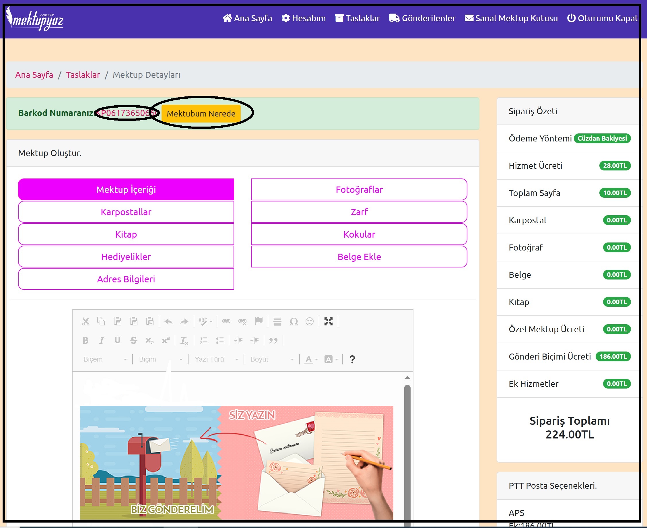 Hızlı Barkod Erişimi: Hesabınıza giriş yapın ve Gönderilenlere tıklayın, ilgili mektubun karşısında ki yeşil göz simgesine tıklayın. Otomatik olarak mektup detayları açılır. Açılan sayfada üst kısımda KP veya TP ile başlayan barkod numarasına tıkladığınızda, alternatif sorgulama ekranları saniyeler içinde açılır.