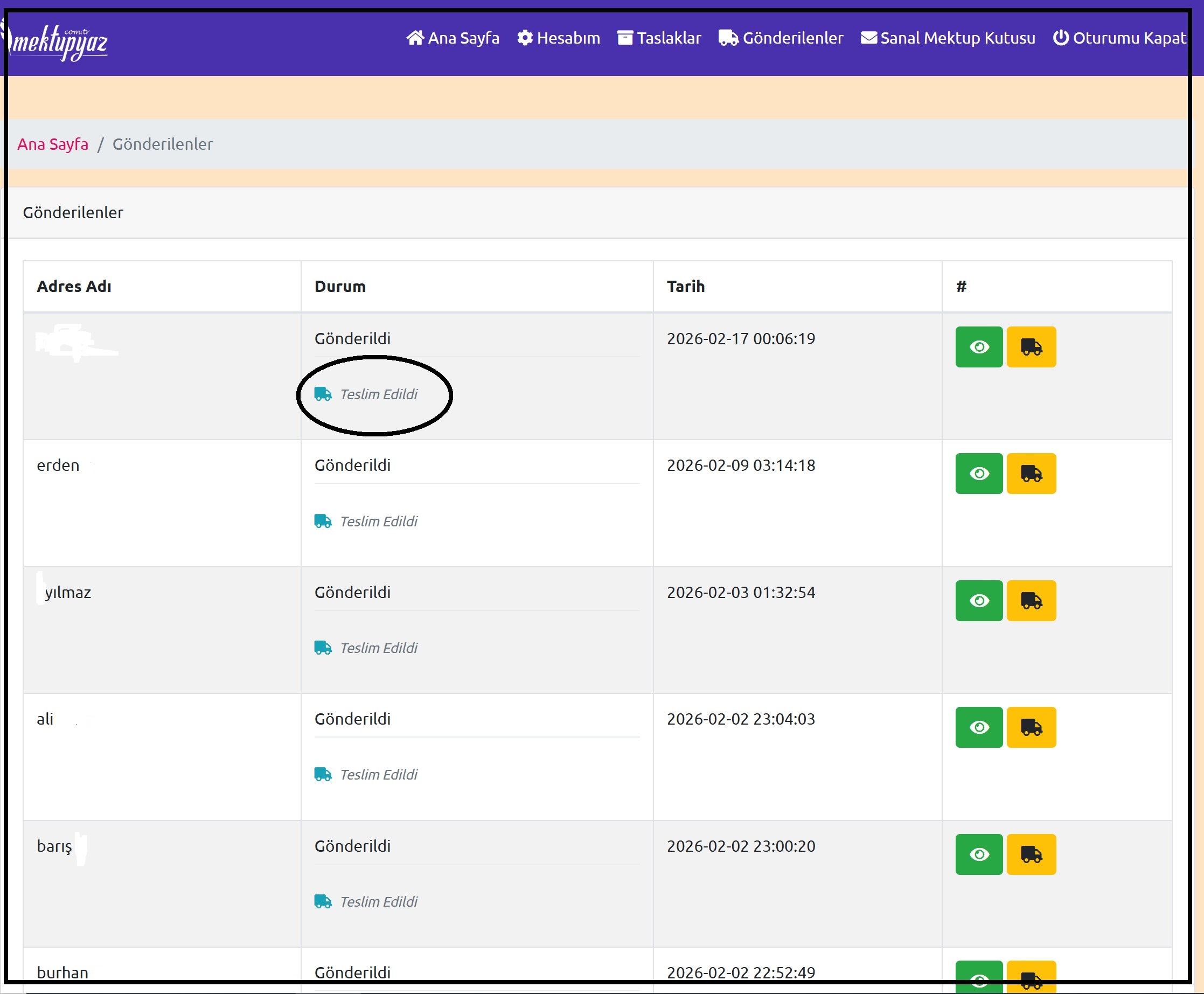Panel Üzerinden Canlı Durum Sorgulama: Hesabınıza giriş yapıp "Gönderilenler" sekmesine tıkladığınızda; Kabul Edildi, Yolda, Teslim Edildi gibi güncel durumları doğrudan satır içerisinde görebilirsiniz.